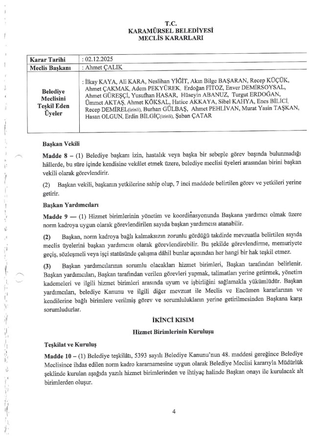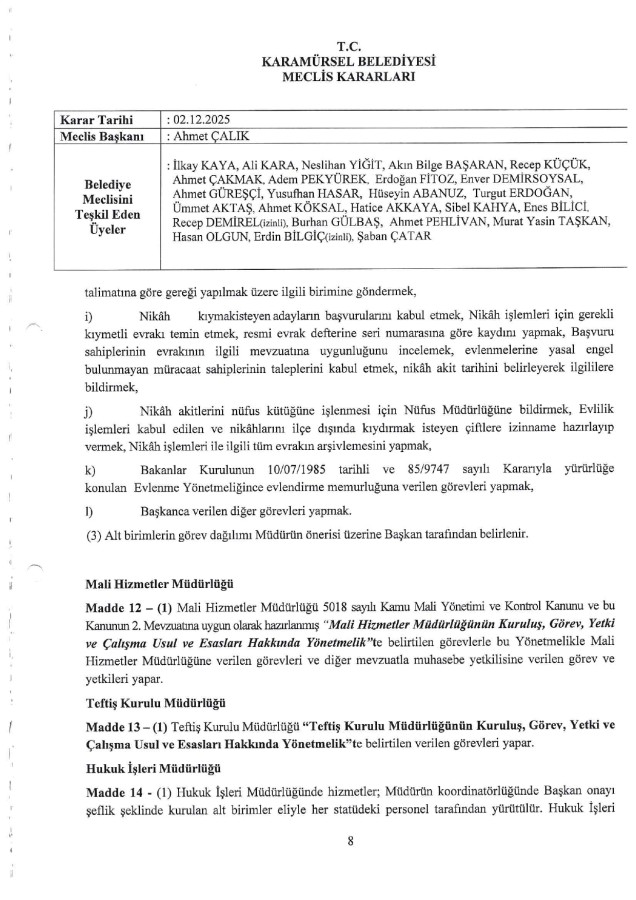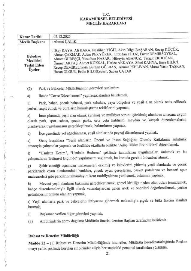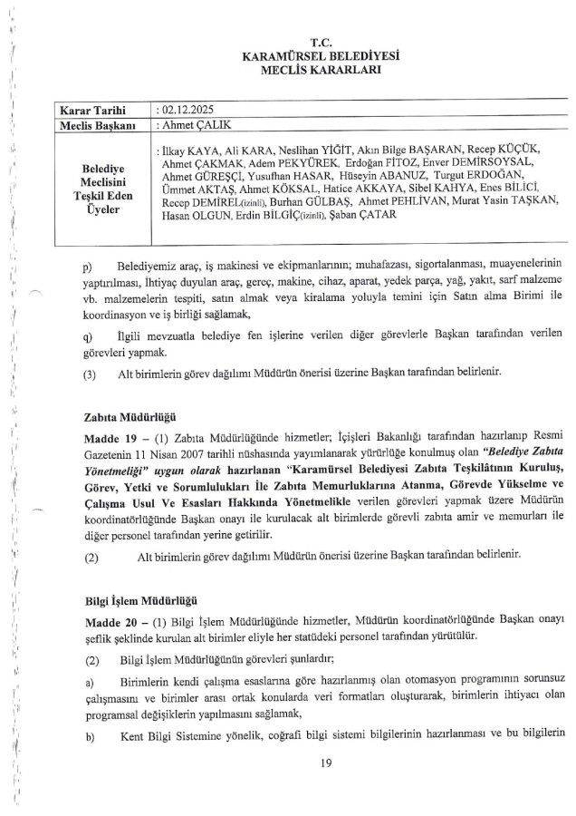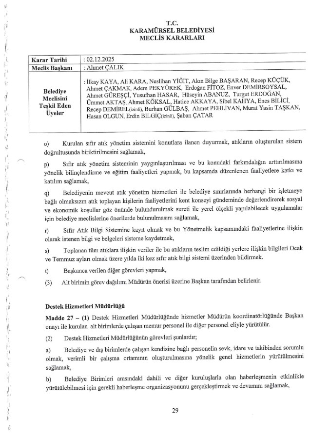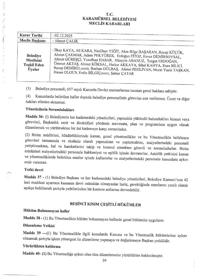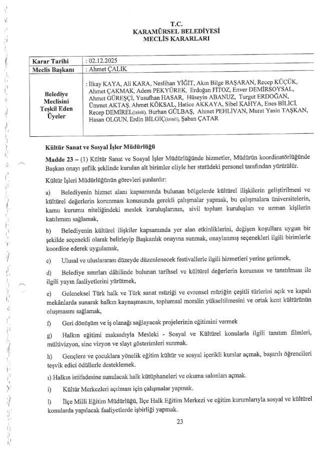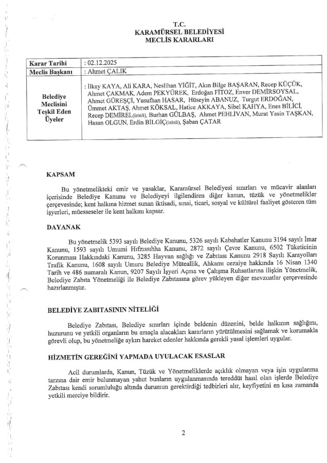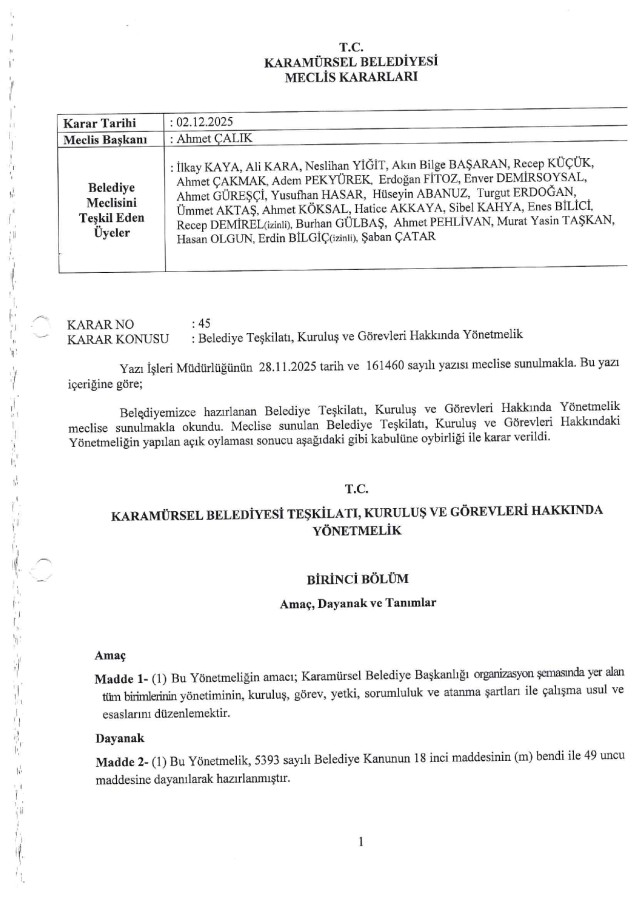Karamürsel Belediyesi Sosyal Yardım Yönetmeliği",  "Karamürsel Belediyesi İlan Reklam ve Tabela Yönetmeliği", "Karamürsel Belediyesi Estetik Kurulu Çalışma Esas ve Usullerine İlişkin Yönetmelik", "Karamürsel Belediyesi Zabıta Müdürlüğü Emir ve Yasakları Uygulama Yönetmeliği" ile "Belediye Teşkilatı Kuruluş ve Görevleri Hakkında Yönetmelik"