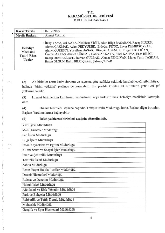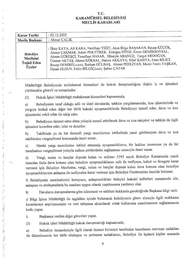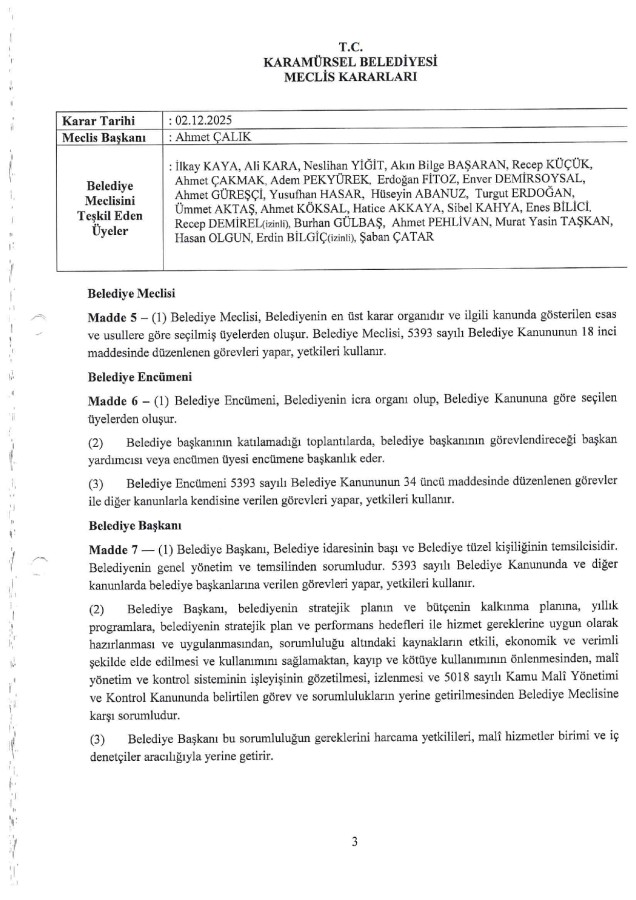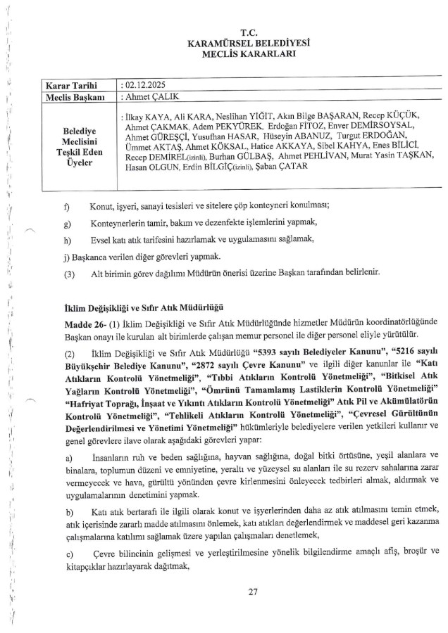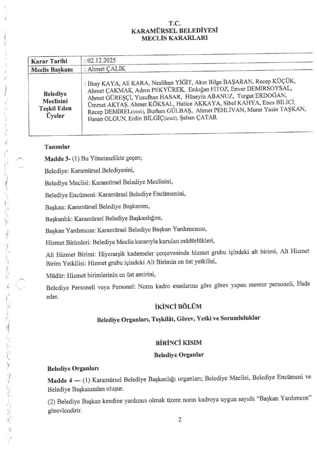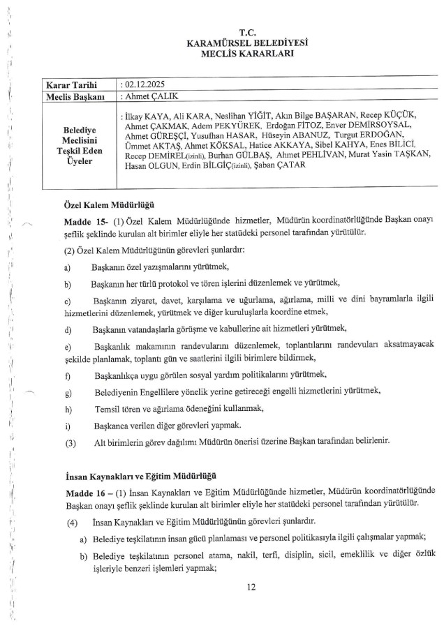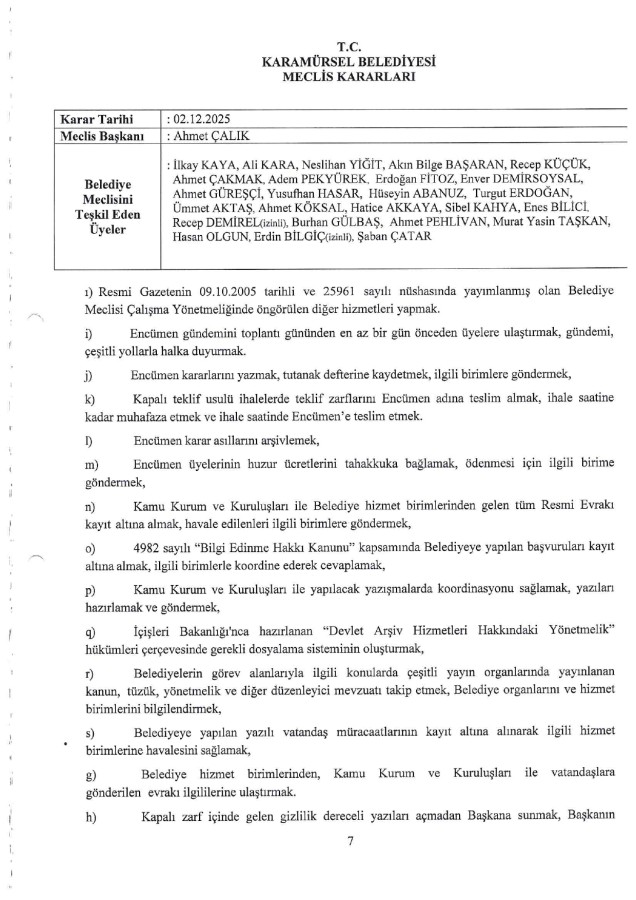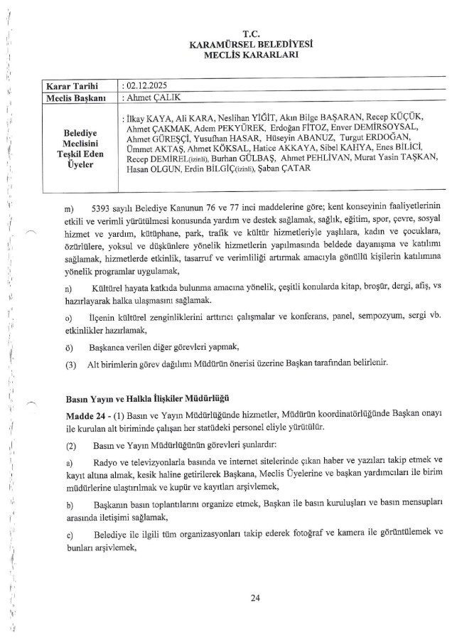 Karamürsel Belediyesi Sosyal Yardım Yönetmeliği",  "Karamürsel Belediyesi İlan Reklam ve Tabela Yönetmeliği", "Karamürsel Belediyesi Estetik Kurulu Çalışma Esas ve Usullerine İlişkin Yönetmelik", "Karamürsel Belediyesi Zabıta Müdürlüğü Emir ve Yasakları Uygulama Yönetmeliği" ile "Belediye Teşkilatı Kuruluş ve Görevleri Hakkında Yönetmelik"
