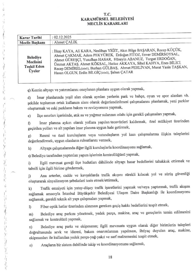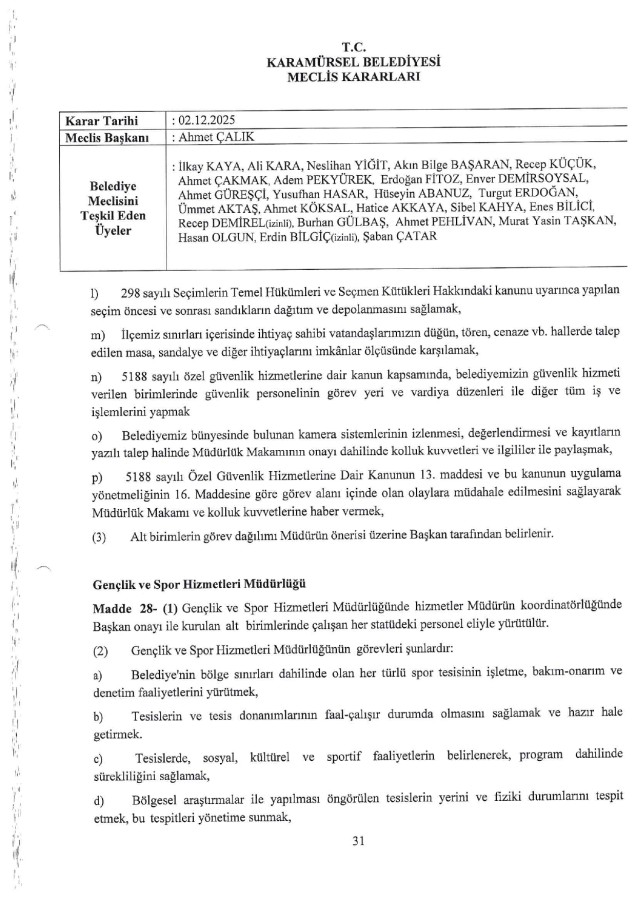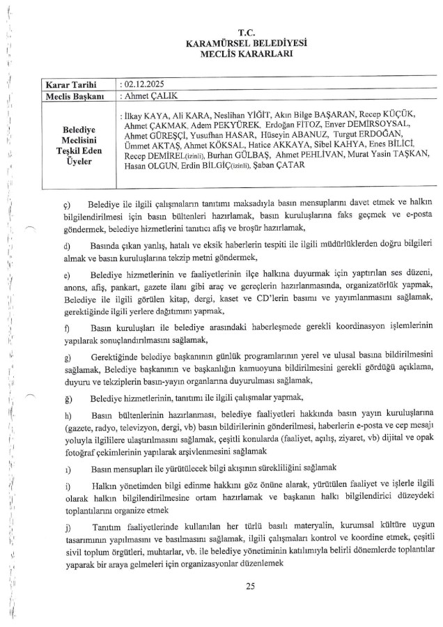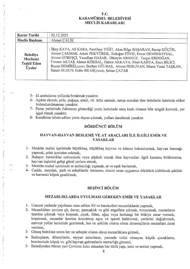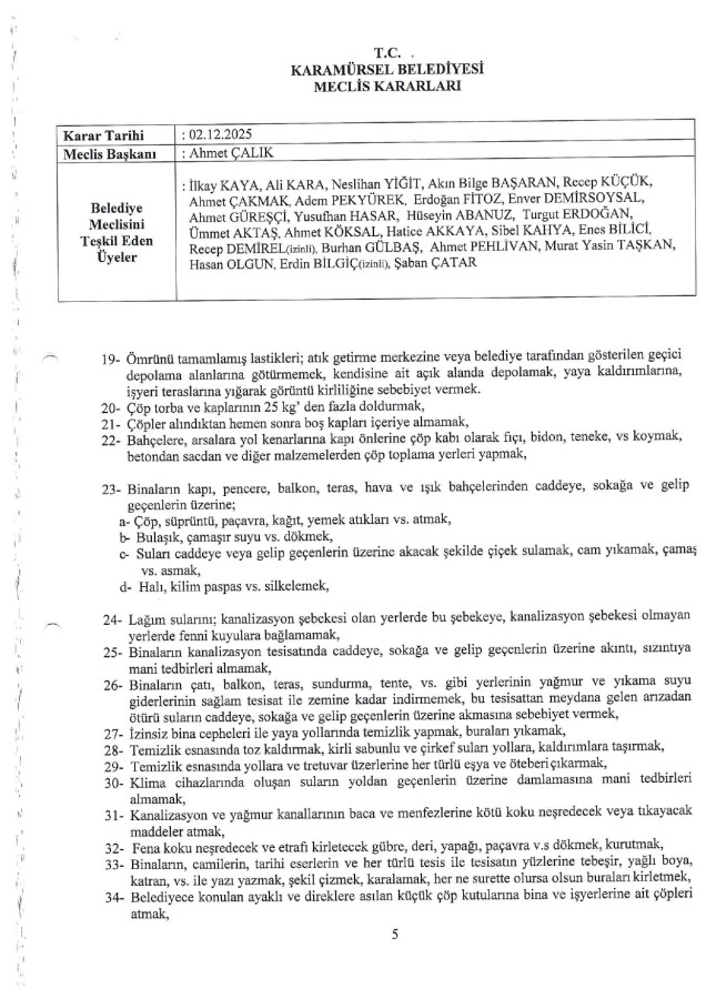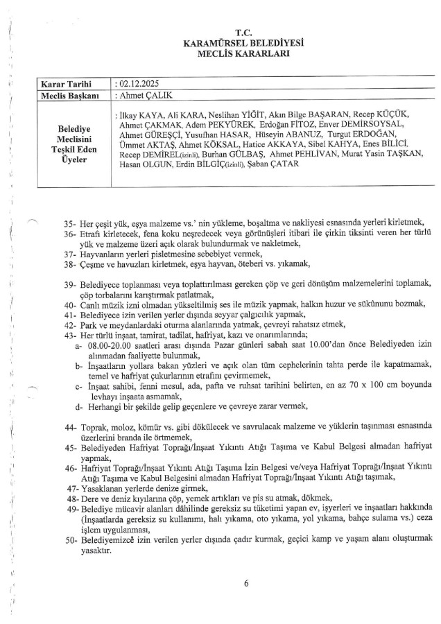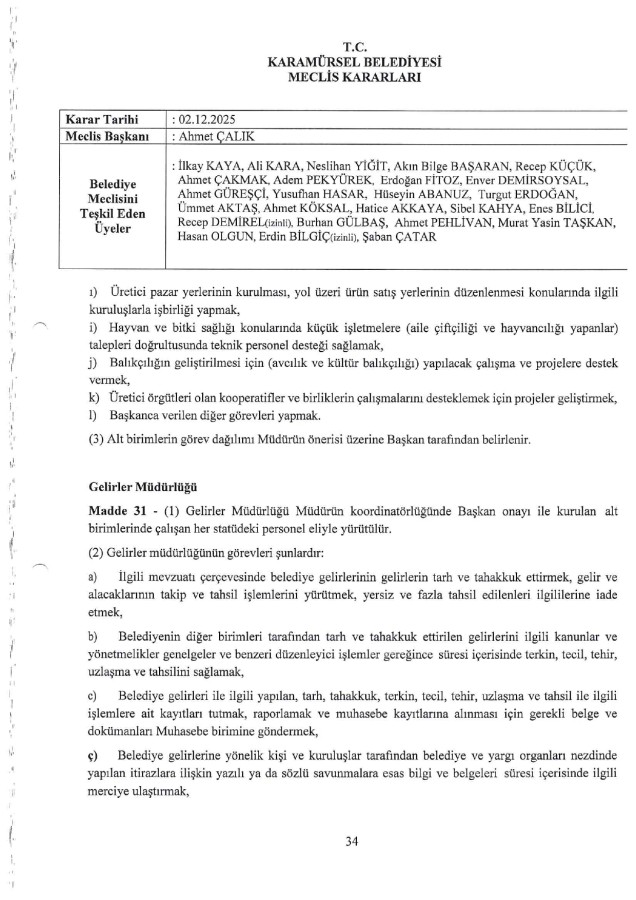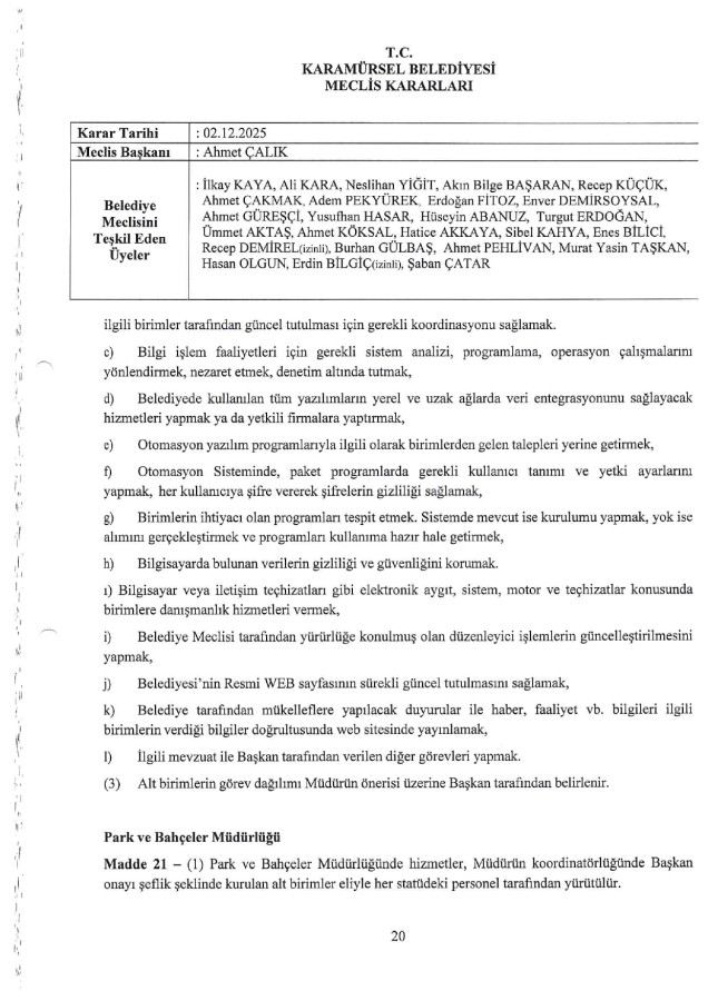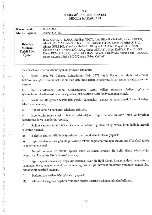 Karamürsel Belediyesi Sosyal Yardım Yönetmeliği",  "Karamürsel Belediyesi İlan Reklam ve Tabela Yönetmeliği", "Karamürsel Belediyesi Estetik Kurulu Çalışma Esas ve Usullerine İlişkin Yönetmelik", "Karamürsel Belediyesi Zabıta Müdürlüğü Emir ve Yasakları Uygulama Yönetmeliği" ile "Belediye Teşkilatı Kuruluş ve Görevleri Hakkında Yönetmelik"