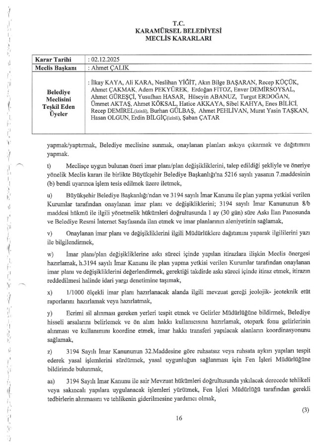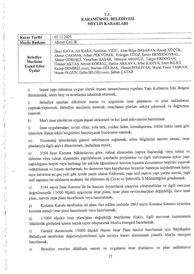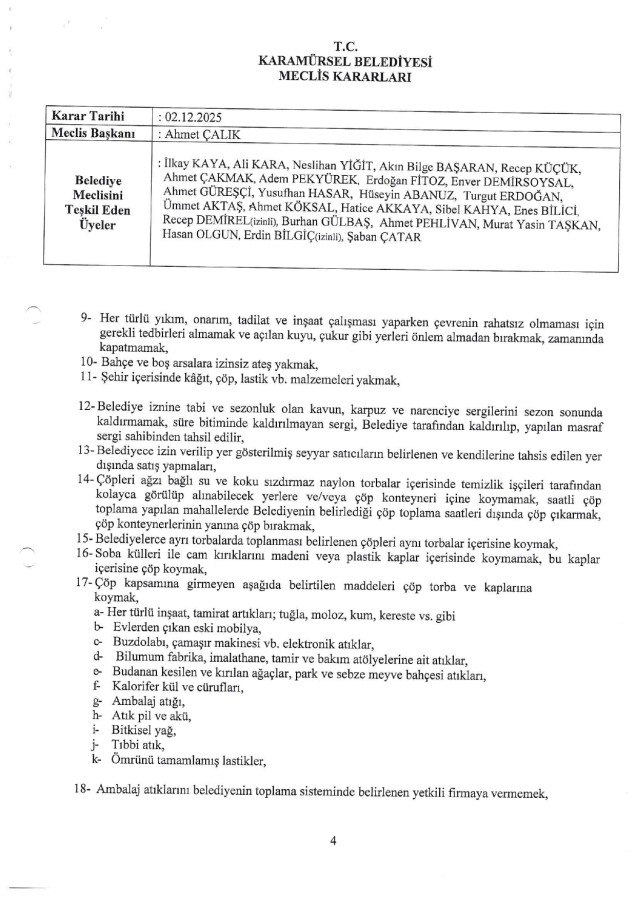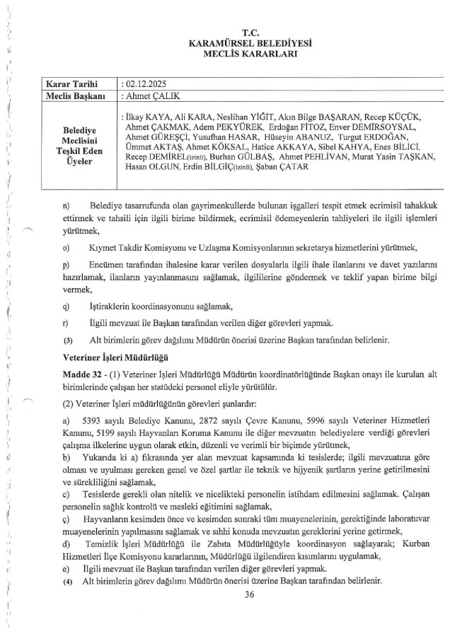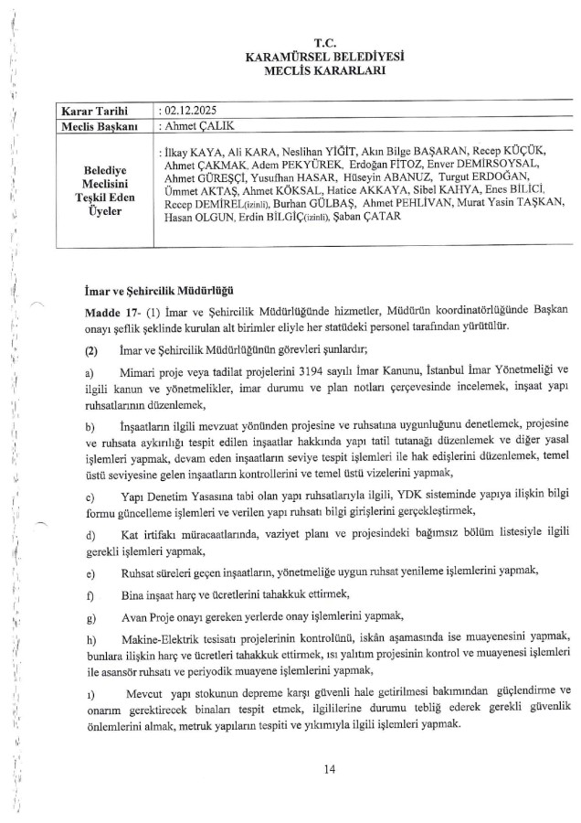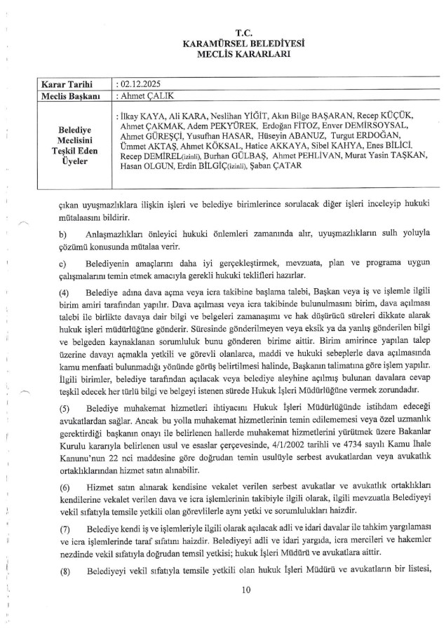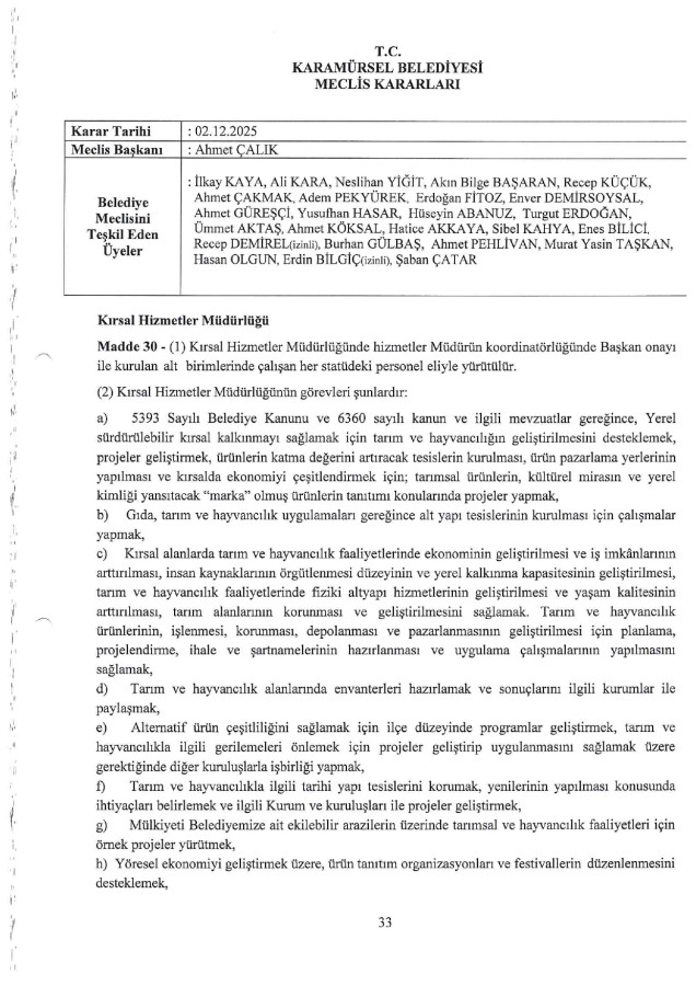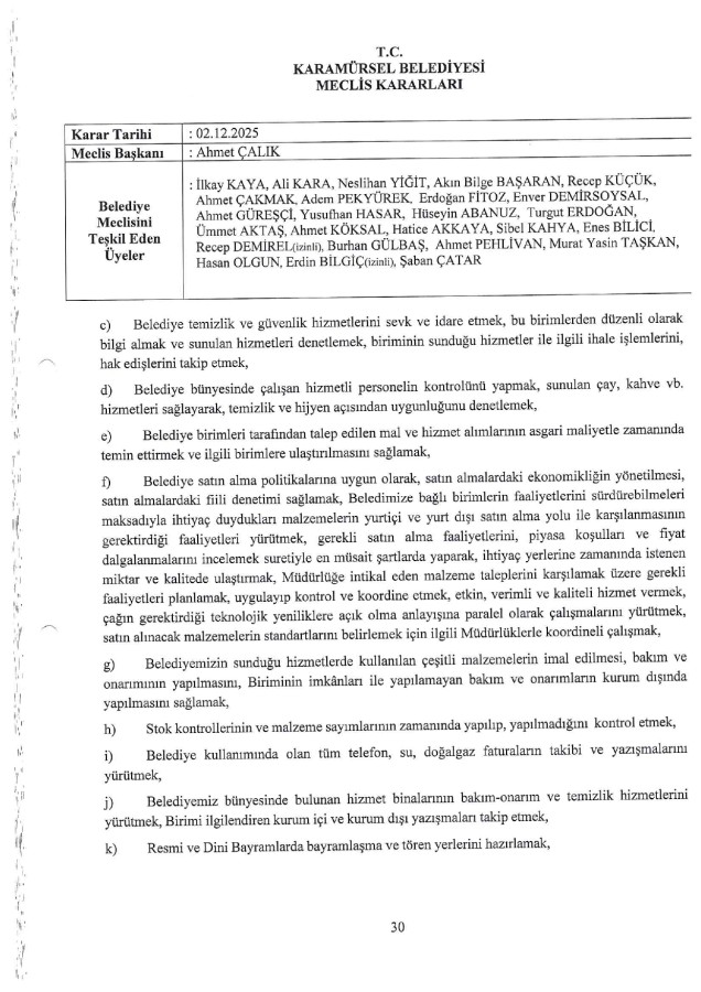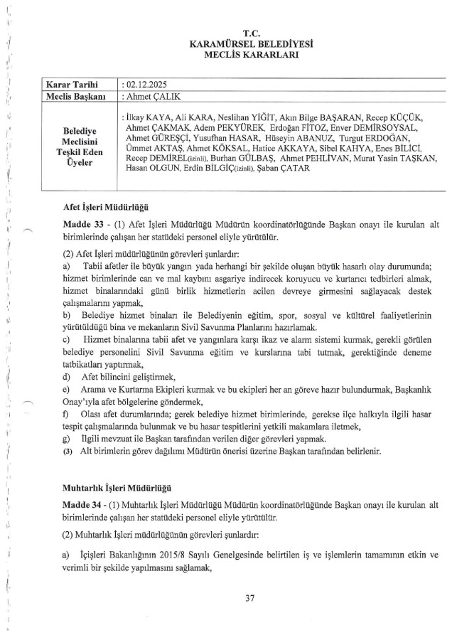 Karamürsel Belediyesi Sosyal Yardım Yönetmeliği",  "Karamürsel Belediyesi İlan Reklam ve Tabela Yönetmeliği", "Karamürsel Belediyesi Estetik Kurulu Çalışma Esas ve Usullerine İlişkin Yönetmelik", "Karamürsel Belediyesi Zabıta Müdürlüğü Emir ve Yasakları Uygulama Yönetmeliği" ile "Belediye Teşkilatı Kuruluş ve Görevleri Hakkında Yönetmelik"